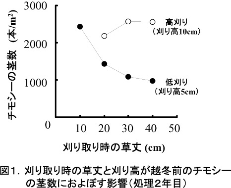 - チモシー(品種名:ホクシュウ)の永続性を茎数密度で判定すると、(1)高刈り条件(刈り取り時草丈20-40cm・刈り高10cm)および(2)低草丈・低刈り条件(刈り取り時草丈10cm・刈り高5cm)で高い(図1)。このようになる原因を以下に示す。