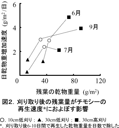 - 多回刈り条件でチモシーの衰退を緩和するためには、刈り取り後に生き残る茎数と残葉を確保することにより、刈り取り後の日乾物重増加速度を高めて他草種の侵入を抑止することが重要である。それには、10cm程度の短い草丈で5cm程度に低刈りするか、または、20-40cmに伸ばしたら10cm程度に高刈りする刈り取り管理が有効である。