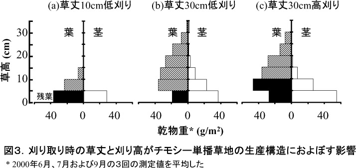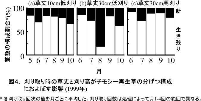 - 分げつの消長からみると、チモシーの有穂茎は生長点を刈り取り切除されると枯死し、新しく発生した分げつに交代する。長く伸ばして低刈りする場合(図4b)には、有穂茎の枯死と新分げつへの交代が7-8月頃に一斉に起こる。新分けつが地上部の再生を開始するまでの間は、一時的に日乾物重増加速度がきわめて小さい状態となるので、他草種に侵入される危険性が高い。短い草丈で低刈りする場合(図4a)や長く伸ばしても高刈りする場合(図4c)には、常に半分以上の茎が生き残り、刈り取り後の再生が確保されるので、植生の維持に有利である。