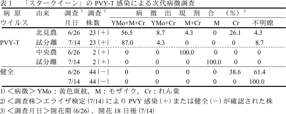 - PVY-T保毒いも由来の「スタークイーン」の次代の主な病徴は、れん葉に黄色斑紋とモザイク症状であり、着蕾期頃から出現し、開花3週間頃まで明瞭で,その後軽微になる。病徴が不明瞭な株は「男爵薯」より少ない(表1)。
