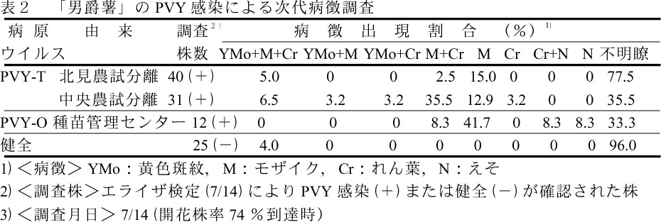 - PVY(T,O)保毒いも由来の「男爵薯」の次代病徴は黄色斑紋、モザイク、れん葉、えそ症状の単独または混合したもので、いずれも「スタークイーン」より軽微であり、病徴が不明瞭な株も多く見られる(表2)。