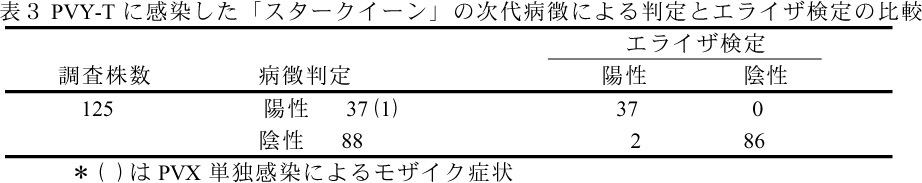 - PVY-T感染株から収穫した保毒いもをほ場に植え、病徴(黄色斑紋とモザイク症状)による肉眼判定とエライザ検定の比較を行った結果、供試125株中123株(98.4%)で両者の判定が一致したことから、本病徴により高い精度で「スタークイーン」のPVY-T感染の有無を識別できる(表3)。