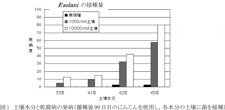 - にんじんの乾腐病は北海道道南地方で多発し,主な病原菌はFusarium solaniである。本病の発生は,にんじんの生育ステージと温度,土壌水分が関わっており,播種後60〜83日の間に土壌水分が高く維持されると発病する。