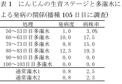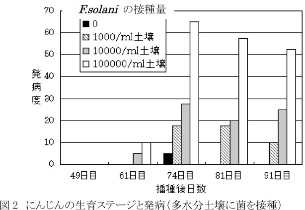 - 発病要因解析:異なる土壌水分条件下でにんじんへ病原菌を接種すると,水分含量が高くなるにつれて発病が多くなった(図1)。また,ほ場容水量条件下では25℃以上では多発し,15℃〜25℃では発病は少なかった。生育中のにんじんを定期的に汚染土に移植したところ,播種49日後の株では発病発病は認められず,74日後以降の株で激しく発病した(図2)。汚染土に播種したにんじんを,灌水によって一時的に水分飽和状態にしたところ,その時期が播種後50日目頃では発病は少なく,60〜80日目では多くなり,90日目以降では発病は見られなかった(表1)。