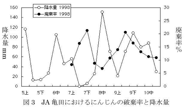 - 現地の発病状況:播種60日以前のものに発病は認められず,それ以降のまとまった降雨から20〜30日後に発病が見られた。平成10年,12年の共選場におけるにんじん廃棄率は,多量の降雨の30日後に上昇しており,廃棄の主因は乾腐病によるものであった(図3)。