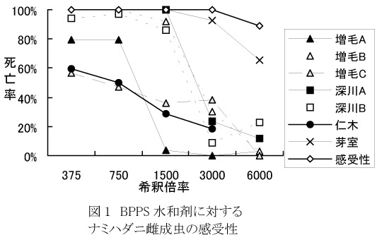 - BPPS水和剤に対しては、ナミハダニでは増毛町の3系統および仁木系統が抵抗性を示し、深川市から得られた2系統も感受性が低下していた(図1)。これらの地域においては、毎年BPPS剤の散布を続けることはさらに強い抵抗性の発達につながる可能性が高い。