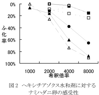 - ヘキシチアゾクス水和剤に対しては、ナミハダニの仁木系統および増毛A、増毛C系統で感受性が低下していた。これらの地域においては、これ以上の感受性の低下を防ぐため、ヘキシチアゾクスおよび同系のクロフェンテジンの毎年の散布は避けるべきである。(図2)。