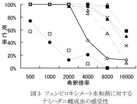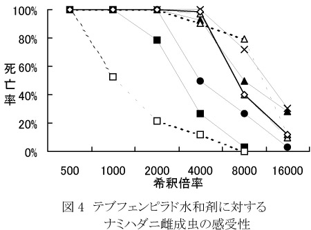- フェンピロキシメート水和剤に対しては、ナミハダニでは深川B系統および仁木系統で抵抗性が発達していた(図3)。このうち、テブフェンピラドを連続散布していたほ場から得られた深川B系統は、テブフェンピラドに対しても抵抗性を示した(図4)。