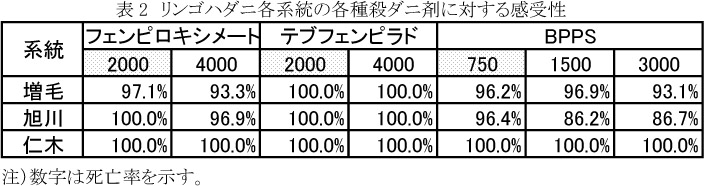 - リンゴハダニに関しては、増毛町の系統はフェンピロキシメートおよびBPPSに、旭川市の系統はBPPSに対しやや感受性が低下していたが、その程度は低く、実用上は問題ないと考えられる(表2)。