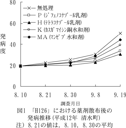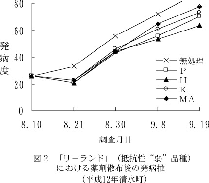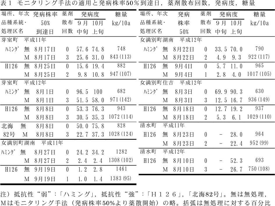 - さらに少発生(平成11年,12年,女満別町)の場合,9月まで発病株率が50%に達しないことがあり,このような場合には薬剤散布の必要はない(表1)。