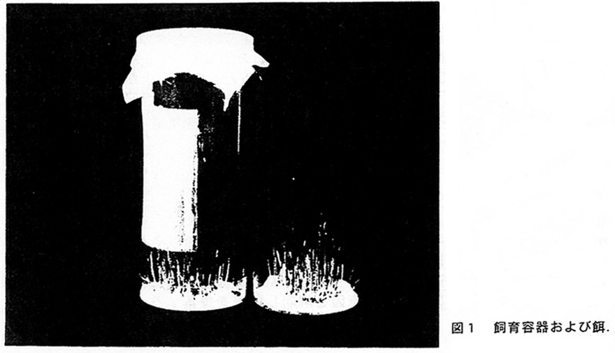 - 餌の調整:プラスチックシャーレ(直径9cm、高さ2cm)の身の部分を用い、脱脂綿を敷いて小麦種子を約5g播種する。種子は予めチウラム・ベノミル水和剤で浸漬処理を行い、カビ等による発芽苗の腐敗を防ぐ。播種したシャーレには十分給水し、16時間照明、22℃の定温器で発芽させる。幼虫用には播種4日目(苗長約1cm)以降から苗が5cm程度のものを用い、成虫用(採卵用)には5〜7cm程度の苗を用いる。