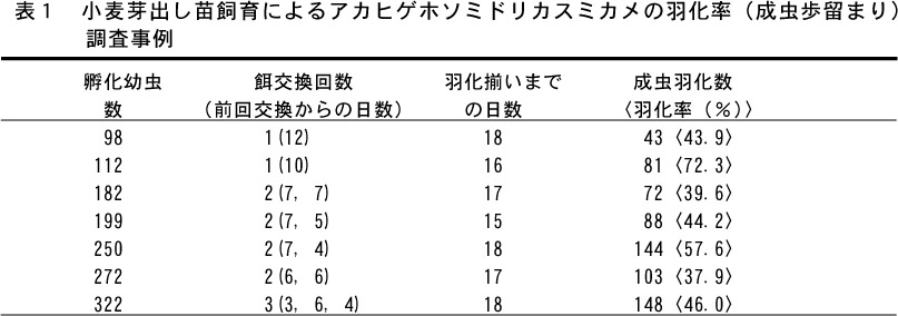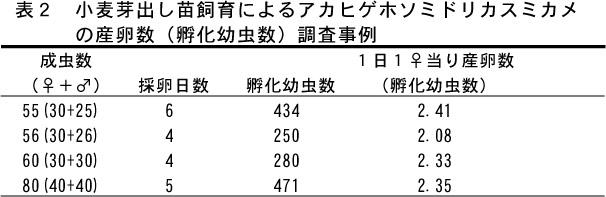 - さまざまな孵化幼虫密度で飼育した事例から、成虫になるまで約17日、羽化率は37.9〜72.3%であった(表1)。また雌成虫30〜40頭(雌雄合計で55〜80頭)、4〜6日の採卵期間で得られる孵化幼虫数は250〜471頭であった(表2)。