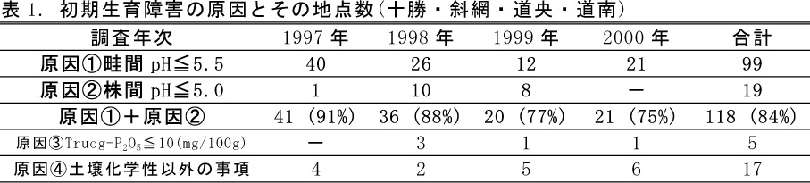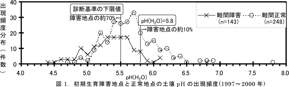 - 初期生育障害発生圃場の80%以上で土壌pHが低く(畦間pH≦5.5または株間pH≦5.0)、初期生育障害の最大の原因は土壌の低pHである(表1)。