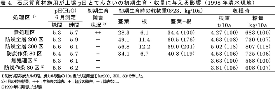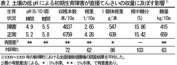 - 土壌の低pHによって初期生育障害を受けたてんさいの個体は6〜7月までの間に枯死あるいは生育停滞し、その結果収穫株数及び1個体根重が減少する。このため収穫期には糖量で最大76%、平均37%減収する(表2)。