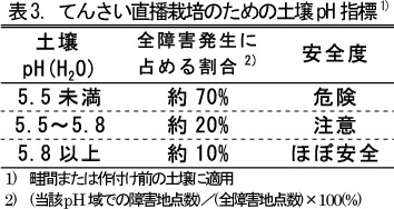 - 現地実態調査を基に生育障害地点の土壌pHの頻度分布を検討した結果、畦間pH5.8以上の領域での障害地点数は全体の約10%以下であり、畦間pH5.5〜5.8の領域には障害地点の約20%が分布した(図1)。これらを根拠として土壌pH指標を提案する(表3)。