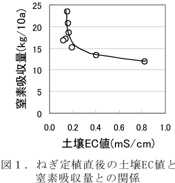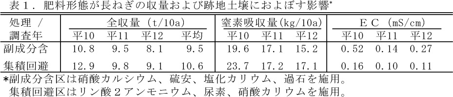 - 副成分を含有しない肥料を施用することによって土壌のEC値は低く維持され、長ねぎの窒素吸収量が高まる(表1)。