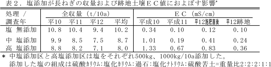 - 塩添加に伴い土壌EC値は顕著に上昇し、長ねぎの収量は低下する(表2)。
