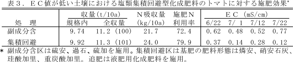 - 副成分を含有する肥料は土壌の電気伝導率(EC値)を上昇させ、作物の窒素吸収量を低下させるが、塩類集積回避型肥料はEC値を低く維持し、作物の生育が促進されるため、施設野菜の持続的生産のために有効である。