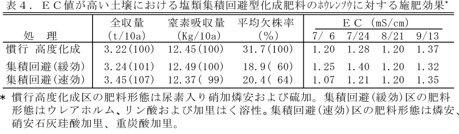- 塩類集積の進んだ農家ハウスでは、塩類集積回避型化成肥料は欠株率が低下したが窒素の肥効は緩効性・速効性ともに、高度化成と同程度である(表4)。