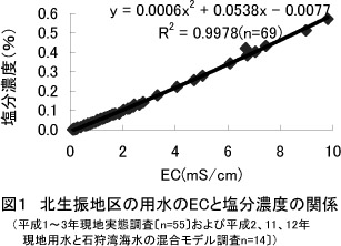 - EC(電気伝導度)と塩分濃度は高い相関関係があり、ECにより塩分濃度を推定できる(図1)。