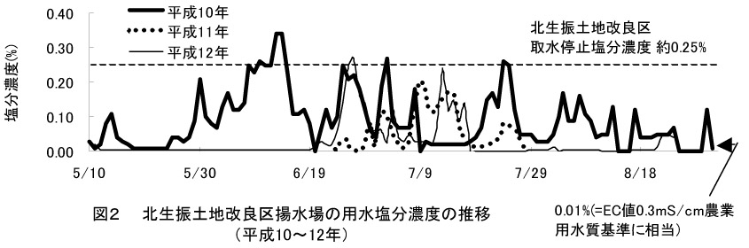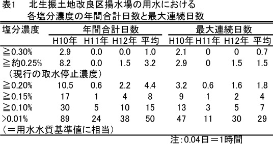 - 現地事例から次のことがいえる。(1)干ばつ害を回避するためには塩分濃度0.10%以上での短期的な取水はやむを得ない(表1、図2)。(2)塩分濃度0.25%以下の用水による明らかな減収は確認されていない。(3)用水塩分濃度変化は急激におこり、その予測は不可能である。