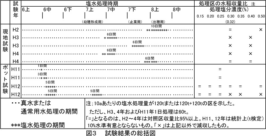 - 幼穂形成期後に、塩分濃度0.30%以上の用水を6日間以上かんがいしたときに減収を招く場合が多い。幼穂形成期までに、塩分濃度0.30%以上の用水を、5日間のみかんがいした場合は減収しないが、合計10日間かんがいした場合は明らかに減収する(図3)。以上から、取水停止塩分濃度を0.30%未満に設定する。