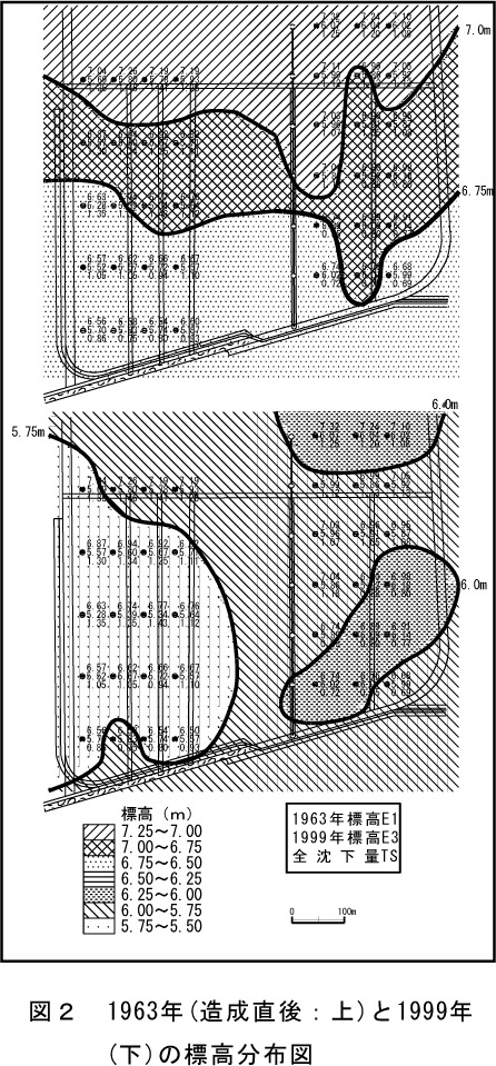 - 造成直後の1963年の38地点の標高(E1)は6.50m〜7.32mで、東方に向かって標高は高い傾向を示す(図2)。造成11年後の1974年の標高(E2)は5.86m〜7.02mで、造成36年後の1999年の標高(E3)は5.28m〜6.18mである。