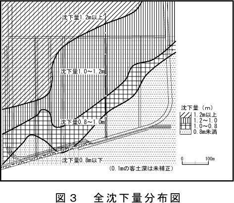 - 1999年までの36年間の全沈下量(TS=E1-E3)は0.69〜1.47mで、平均1.06m(置土深は未補正)で北東に向かって沈下量は大きい(図3)。