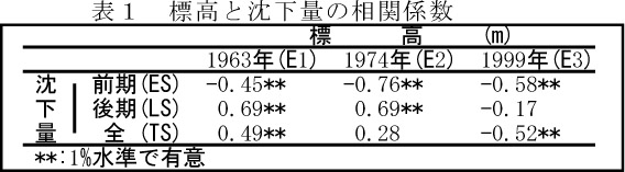 - 各測定年の標高(E1,E2,E3)と前期沈下量(ES=E1-E2)、LS及びTSとの相関係数は表1のようである。全沈下量は1963年標高と正、1999年標高と負の相関があった。すなわち、E3の高い地点は基盤の鉱質土標高が高く、泥炭層厚が薄いため沈下量が小さい事を示唆する。