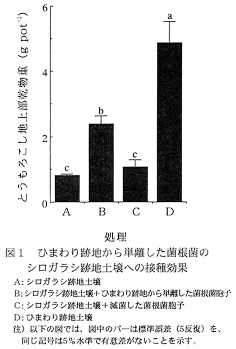 - とうもろこし(品種名:パイオニア3790)の生育(播種50日目)は、菌根菌の宿主であるひまわり跡地(D)に比べて非宿主のシロガラシ跡地(A)で劣る。3kgのひまわり跡地土壌から単離した菌根菌胞子(1.7g)を3kgのシロガラシ跡地土壌に接種(B)することにより、シロガラシ跡地のとうもろこし生育が改善される(図1)。滅菌した胞子(C)を接種しても効果はない。