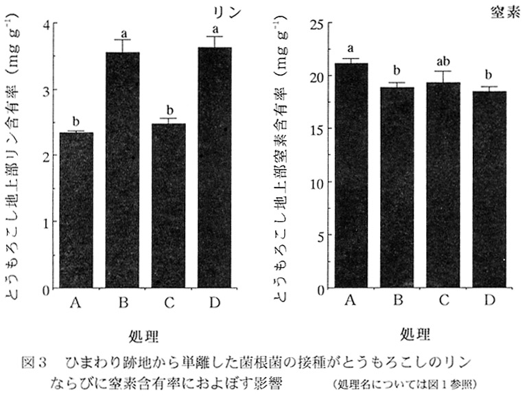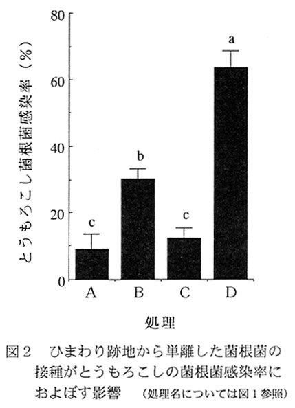 - 菌根菌接種区(B)のとうもろこし生育がひまわり跡地(D)より劣る原因としては、単離過程での菌根菌胞子の活性低下のほか、感染源となり得る菌根菌の菌糸や感染根が胞子画分に含まれていないことなどが考えられる。