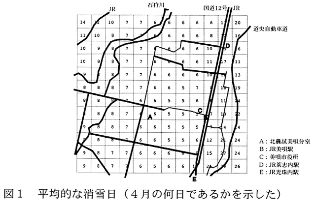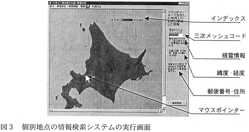 研究課題名:気象の変動特性の解析とメッシュ化、 自己増殖事例ベースおよびVRMLを用いた栽培適地マップ作成インターフェースの開発 予算区分 :地域総合、増殖情報ベース 研究期間 :平成8年〜平成11年度、平成8年〜平成14年 担当者 :鮫島良次、喜多孝一、伊藤淳士、山田一茂 発表論文等:Weibull分布を用いた積雪の長期継続期間とその初日・終日について:農業気象,1998、 北海道の1kmメッシュの根雪情報と表示システム:農気北海道支部大会,2000