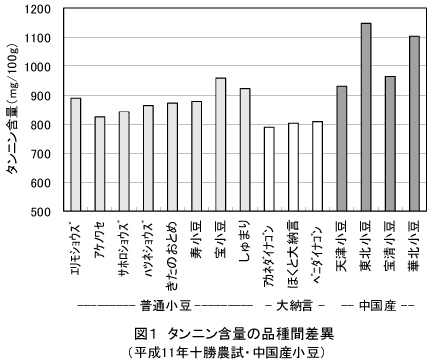 - 小豆のタンニン含量は、普通小豆に比べて大納言小豆では低く、中国産小豆では同程度か高い。また、栽培年次や栽培地によって差が認められる(図1)。