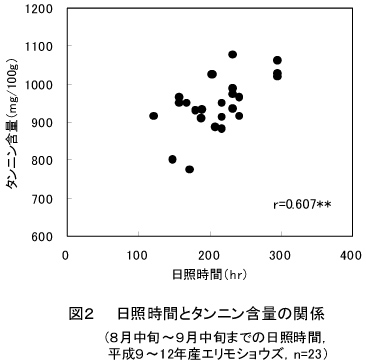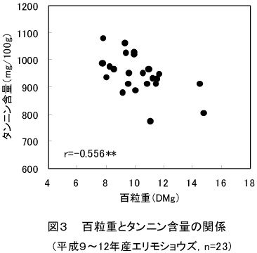 - 8月中旬〜9月中旬までの日照時間とタンニン含量の間には有意な正の相関関係(r=0.607**,図2)が認められる。また、百粒重とタンニン含量の間には有意な負の相関関係(r=−0.556**,図3)が認められる。