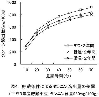 - タンニン含量は、普通小豆に比べて大納言で低く、中国産で同程度か高い。登熟期間の日照時間が長く、百粒重が小さくなる気象条件ではタンニン含量が高まる。また、貯蔵温度が低いほどタンニンは溶出しやすい。煮汁のタンニン濃度が85mg/100ml以上では強い渋味を感じる。