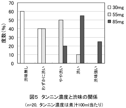 - タンニン濃度と渋味の関係については、ほとんどの人が煮汁中のタンニン濃度が30mg/100ml以下では渋味を感じないが、50mg/100ml以上では渋味を感じ、85mg/100ml以上では強い渋味を感じる(図5)。