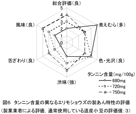 - 加糖あんに加工した場合、タンニン含量の差異はあんの渋味に影響を及ぼすものの、原料小豆の性状や加工業者の製あん技術(渋切り等)により、あんの食味評価は異なる(図6)。