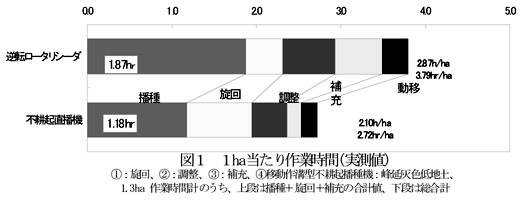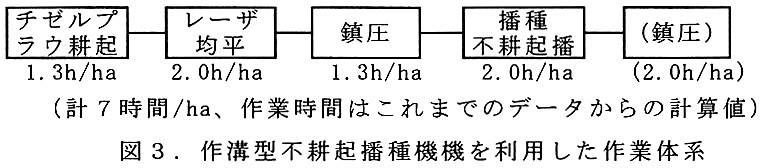 - チゼルプラウ耕起→レーザ均平→鎮圧→不耕起播種機による耕起・施肥・播種の作業体系をとることにより、作業時間は7時間とこれまでよりも1時間短縮でき、必要な苗立ち数を確保できる(図1、図3)。