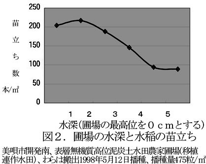 - 作溝型不耕起播種機を利用した乾田直播水稲では、表面施肥は分けつ初期から茎数が少なく収穫期の穂数が不足して低収となる。