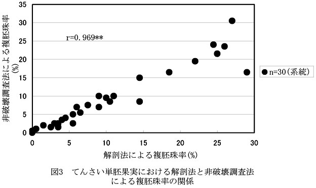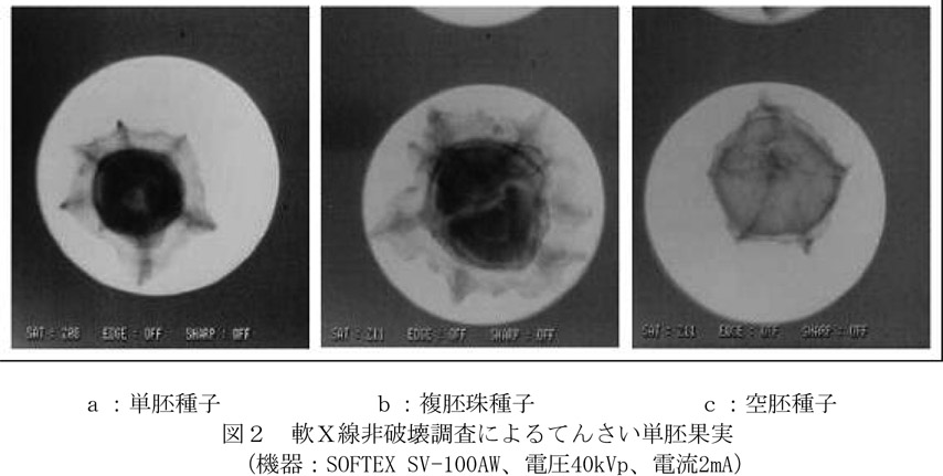 - 本軟X線装置は、現像が不要で、軟X線画像を連続的にモニタ−で観察できる。また、200倍に拡大されるため、複胚珠種子(図2−b)は単胚種子(図2−a)と区別でき、解剖法とほぼ同一精度で判定ができる(図3)。