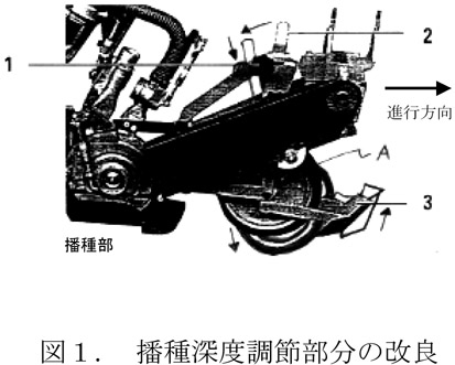 - 作畦輪(A)の角度調整盤(1)の拡大及び軸(2)を延長し、作畦輪及び排土盤(3)を移動することにより、限界播種深4cmがてんさいに最適の2.5cmに改良できる(図1)。
