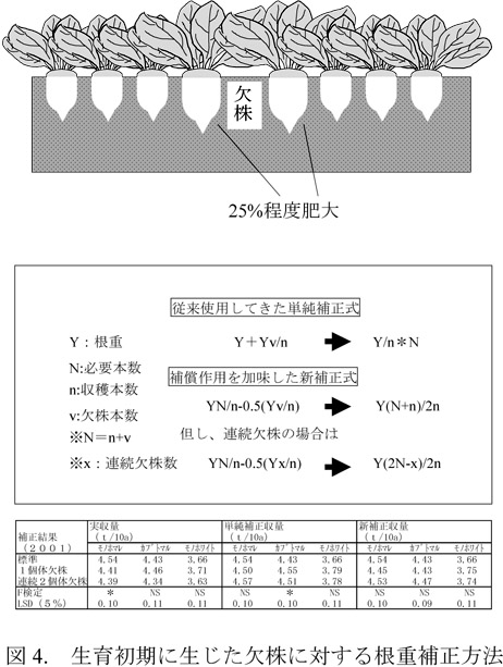 - 図3に示す直播試験法で生育初期に欠株が生じた場合、隣接個体における根重の補償作用は概ね根重平均より25〜35%程度であり、欠株1株あたりの最低補償作用は、0.5本分に相当する。このため、単純補正式から最低補償作用分の0.5本を引いた新補正式により、正確な生産力の評価が可能である(図4)。