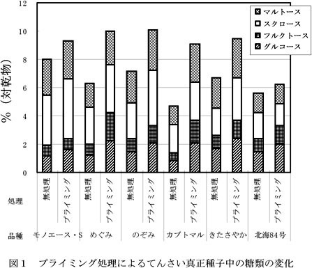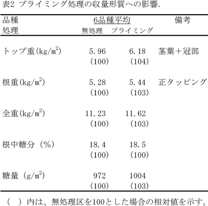 - 種子プライミング処理は、てんさい真正種子中の糖含有率および総デンプン分解酵素活性を高める。これにより、低温下における発芽・出芽が早まり、初期生育が向上し、さらには、収穫期の根重が増加する傾向がある。