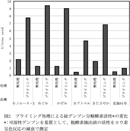 - プライミング処理、総デンプン分解酵素活性、糖含有率、初期生育、根重