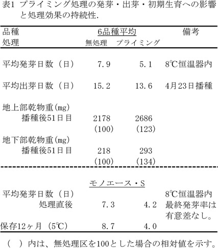 - プライミング種子は、発芽および圃場での出芽が数日早まり、生育の前進化により初期生育量が向上する(表1)。
