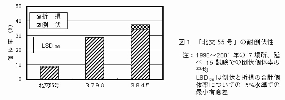 - 「北交55号」はデント種自殖系統「Ho57」を種子親、フリント種自殖系統「Ho49」を花粉親として育成された単交雑一代雑種である。
