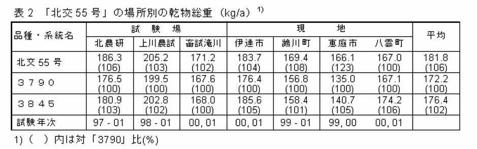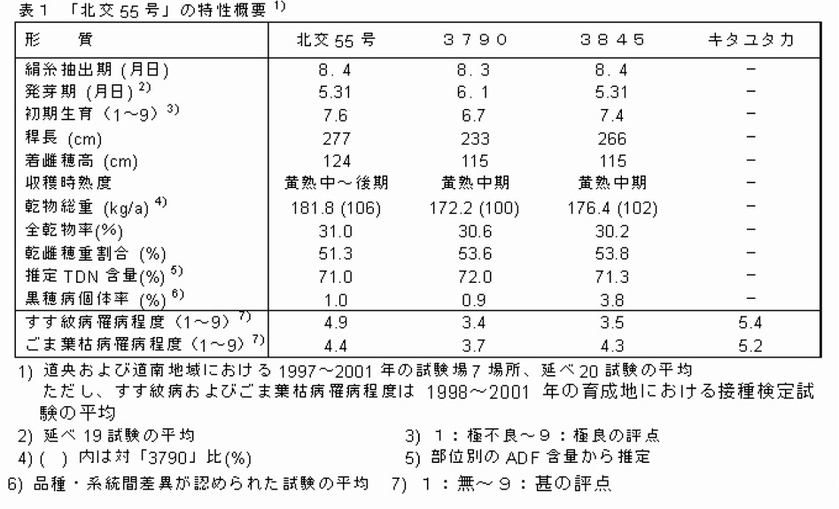 - 耐倒伏性が強い寒地向きサイレージ用トウモロコシのF1品種「北交55号」を育成した。本品種は“中生の中”に属し、多収で、初期生育に優れる。北海道の道央(北部を除く)および道南地域を適地とする。