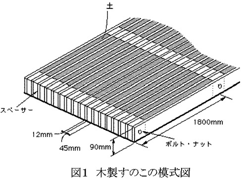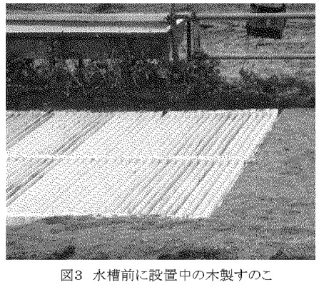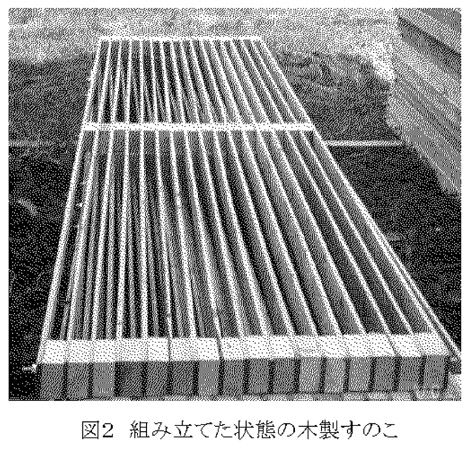 - 単位面積当たりに必要な木材の量を低減するために、断面が12×90mmの木材を使用する。すのこの間隔は、牛の蹄が常に2〜3本の木材に載るように45mm程度とする。スペーサーには木材片およびポリエチレンパイプが使用可能である。長手方向約2mごとにスペーサーを入れ、径12mmのボルトおよびナットで固定する。