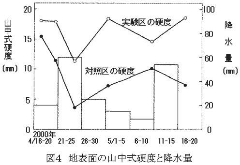 - 搾乳牛約40頭が飼育されているフリーストールのパドック内の水槽前に、約30m2の施工(幅1m、長さ3.6mのユニットを8ユニット設置し、火山礫で埋め戻し)を行い2年間使用し、すのこが土中に埋没したり破損したりせず、泥ねい化の発生を防止できることを確認した(図3)。すのこを設置した場所(実験区)とその近傍で設置しなかった場所(対照区)とで地表面の山中式硬度を測定した。山中式硬度は常に実験区で大きい値を示し、降雨があっても短期間のうちに回復する傾向が認められた(図4)。