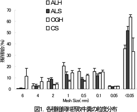- 乾物消化率が同程度(65−69%)の4種類の粗飼料(アルファルファサイレージ;ALS、アルファルファ乾草;ALH、オーチャードグラス乾草;OGH、トウモロコシサイレージ;CS)を1日1回維持量摂取した乾乳牛(各粗飼料区に3頭ずつ配置)では、1mm以上の粒子サイズで反芻胃を通過し、糞中に排泄される割合は13−37%である。牧草類では6mm以上で排出される割合が1%未満であるのに対して、CSでは子実(乾物の約11%)が6mm以上で排泄される(図1)。